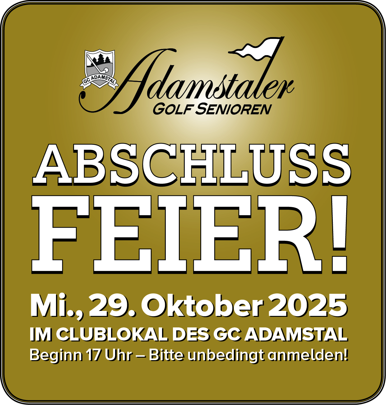 Die nächste Veranstaltung der Adamstaler Senioren ein Teambewerb am Wallerbach Kurs. ( Gespielt wird nur eine Runde nur Nettowertung, wobei die Ergebnisse zusammengezählt werden ) Achtung! Die Anmeldung an der Siegerehrung erfolgt unter 10er Cup anmelden. Bei einer Turnier beteiligung den Vermerk (+ Teambewerb) bekanntgeben. Die Einteilung erfolgt einen Tag zuvor am Dienstag Abend. Gestartet wird im 4er Flight auf Loch 1/2/3/4/9/. Bitte zeitgerecht erscheinen. - ca 13.00 Uhr. Beginn ist 14.00 Uhr mit Kanonenstart. Im Anschluss an den Teambewerb findet die Siegerehrung fürs Turnier und auch die Gesamtwertung des heurigen Jahres im Clublokal bei Claus Curn statt. Beginn ist ca. 17.00 Uhr. Sollte der Matchplay Bewerb abgeschlossen sein werden auch die Preise an die jeweiligen Gruppen Teilnehmer übereicht. Bei der Abschlussfeier muß jeder Teilnehmer seine verköstigung selbst übernehmen. Obwohl der 10er Cup abgeschlossen ist, gehen unsere wöchentlichen Spiele aber denoch weiter, solange das Wetter es zulässt.
